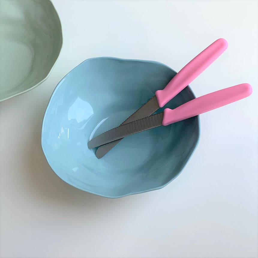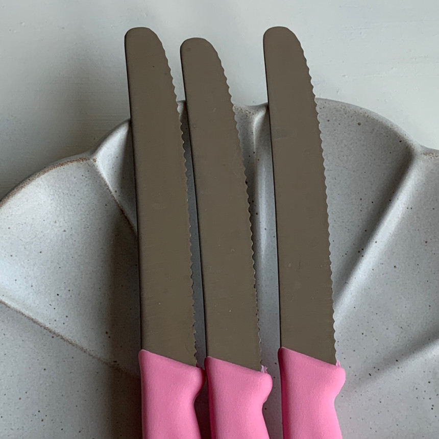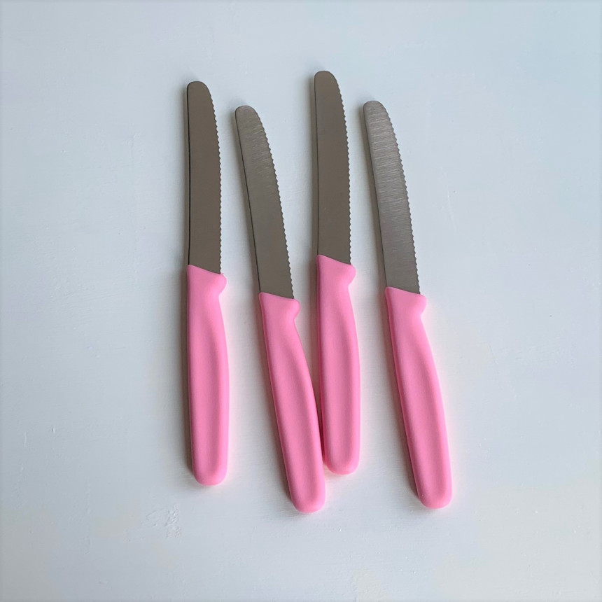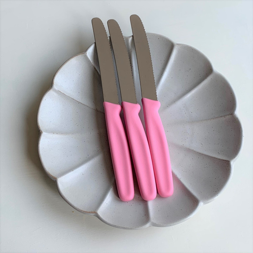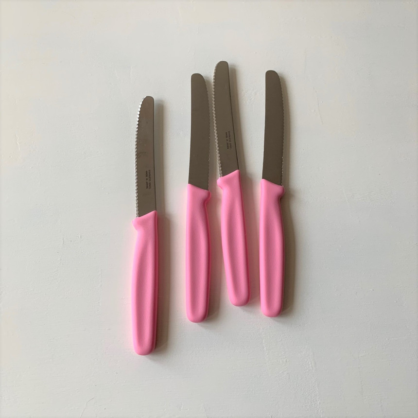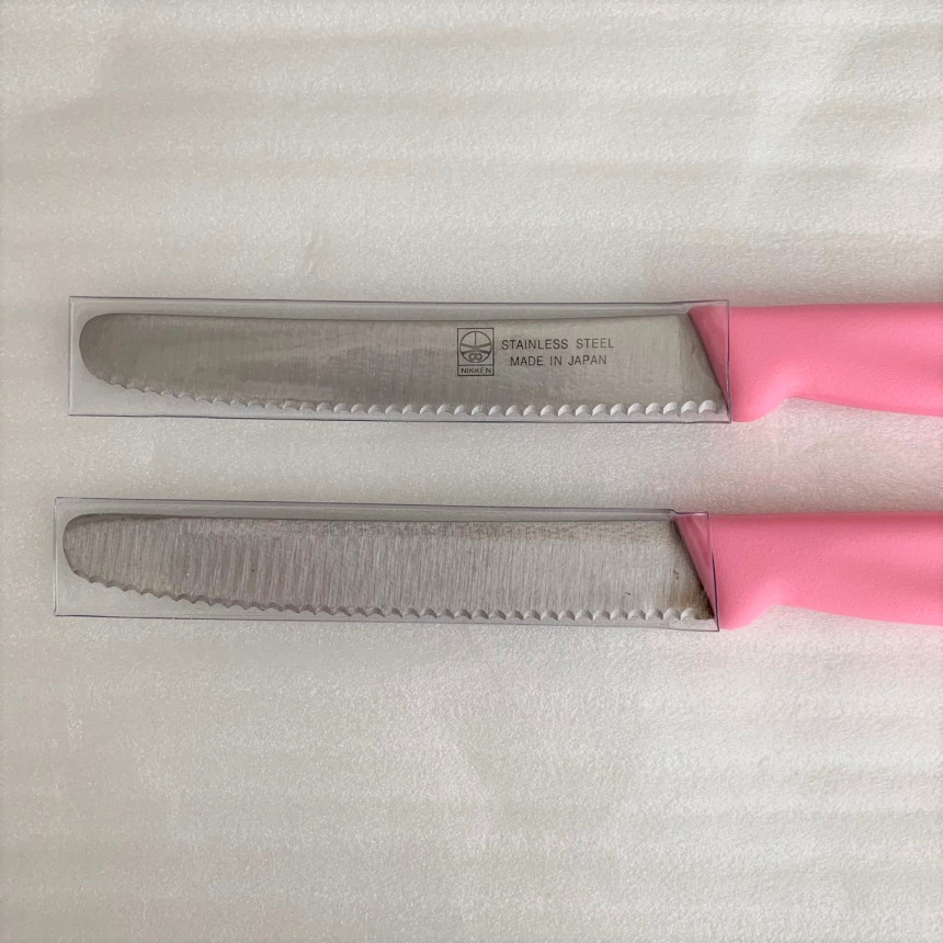 아주 예쁜 핑크 컬러의 과도 입니다. 색감이 예쁘고 무게가 가벼워 주방에 두고 매일같이 사용하게 될 아이템이에요. 손잡이는 그립감이 좋은 기본적인 디자인으로 되어있고 칼날은 톱날이어서 과일은 물론이고 빵을 자를 때도 사용이 가능합니다. 다만 마감이 아주 완벽하지 않을 수 있으니 <구매전 필독사항>을 꼭 확인 부탁드립니다.