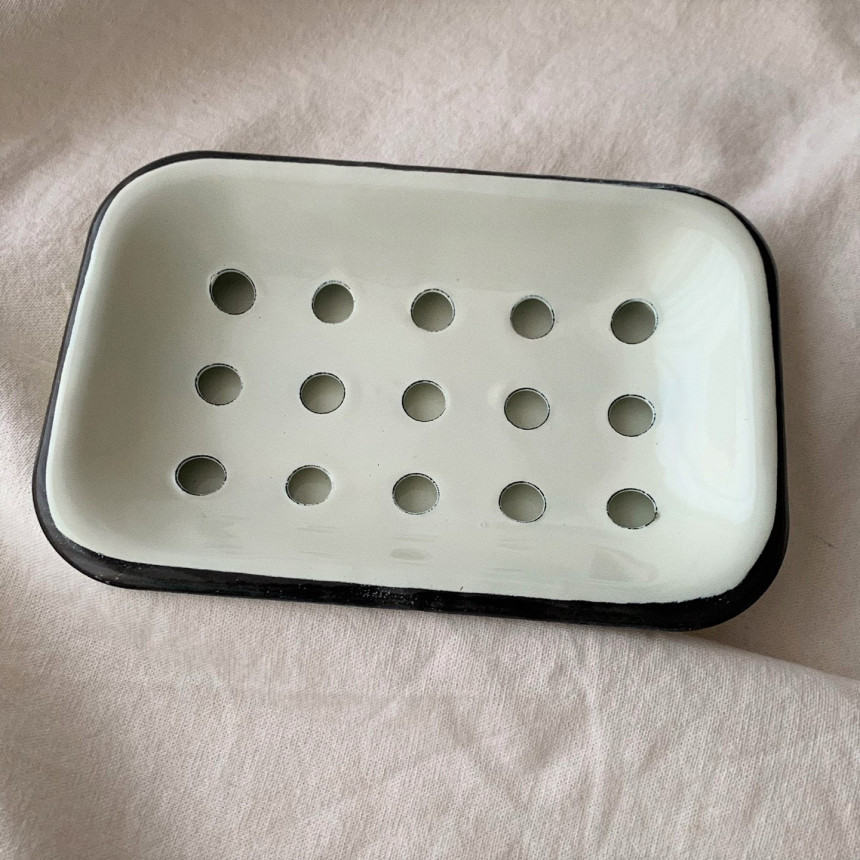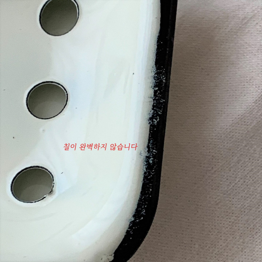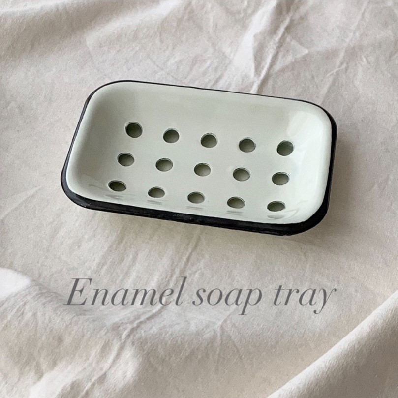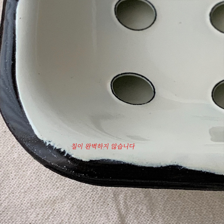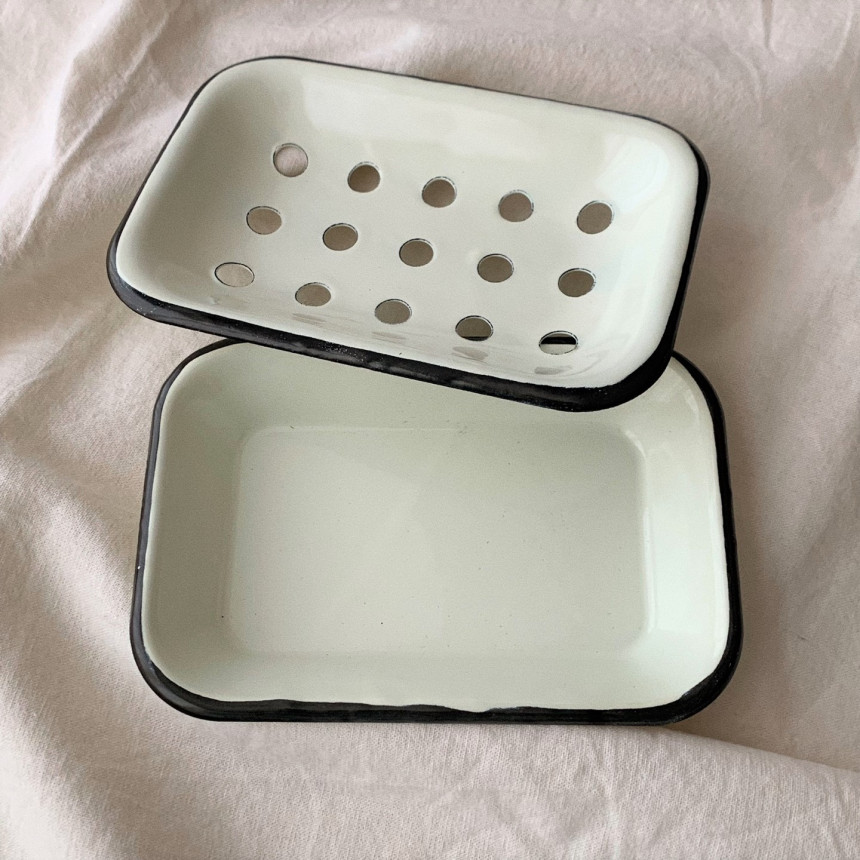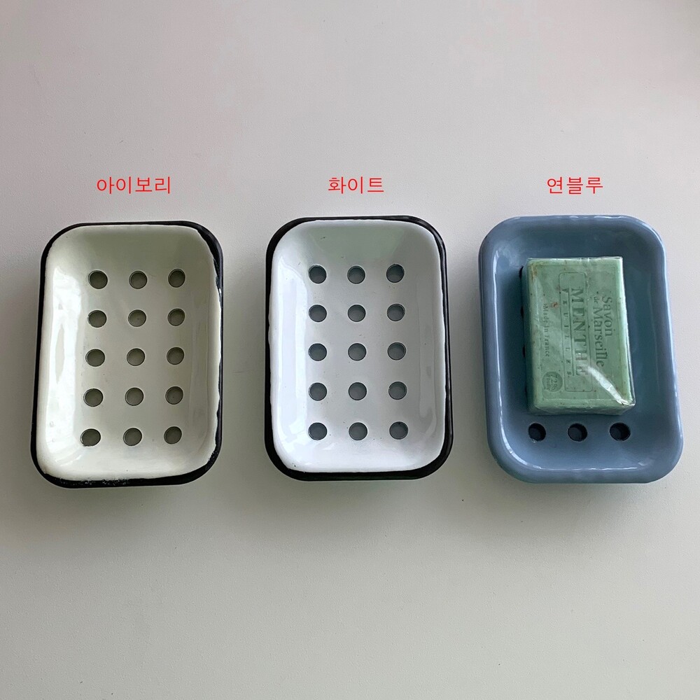 예쁜 비누받침은 정말 찾기 어려운데요, 유럽에서 볼 법한 법랑 소재의 비누트레이를 발견해 소개해드립니다. 물 빠지는 구멍 트레이와 아래 물 받치는 용도의 트레이로 2중으로 구성되어 있습니다. 비누 뿐만 아니라 수세미나, 세제용기 등을 올려놓고 사용하기에도 좋아요. 욕실이나 주방에 법랑 소재의 받침을 두니 분위기가 한층 달라집니다. 주의하실 점은 아주 정교하게 만들어진 제품이 아닙니다. 마감이나 페인트칠이 빈티지한 느낌으로 되어 있으니 민감하신 분들은 구매를 매우 신중히 부탁드립니다.