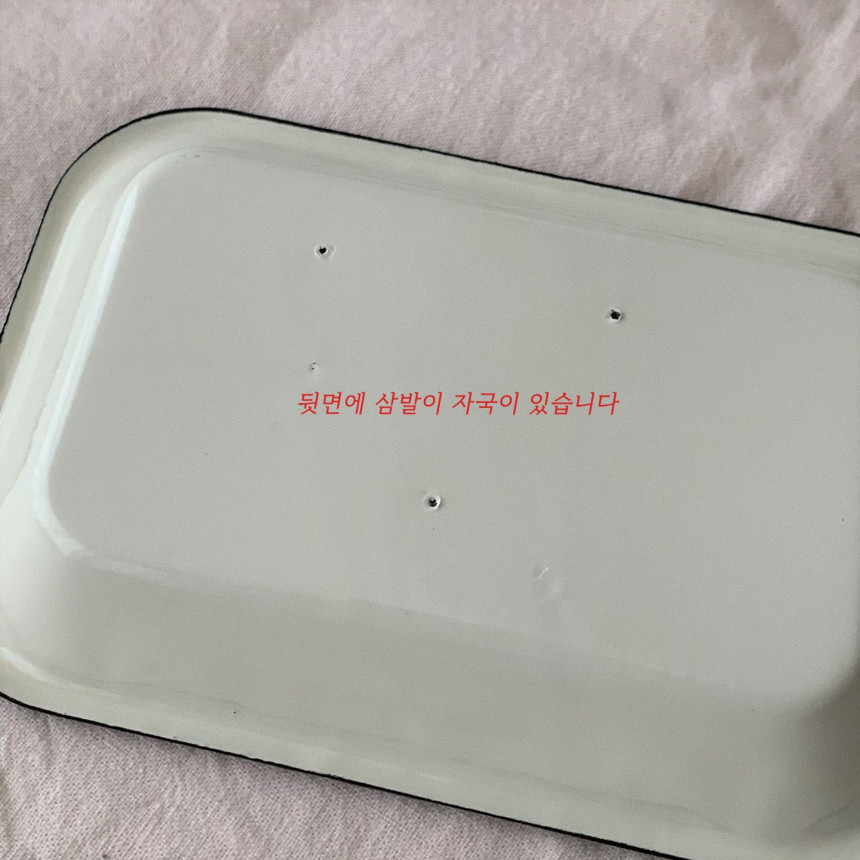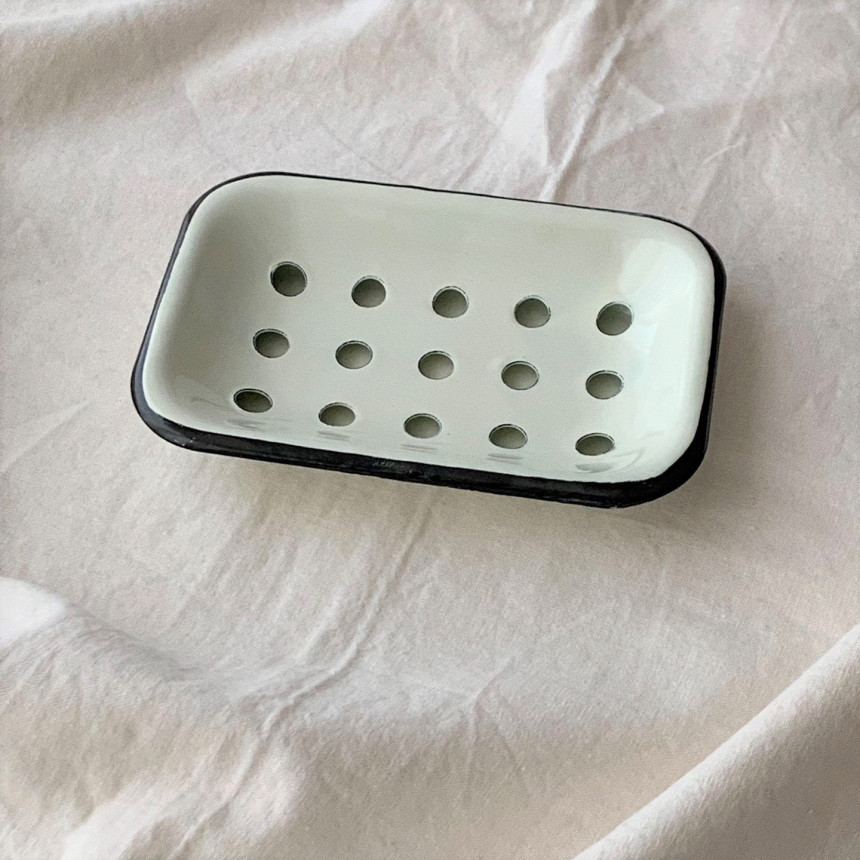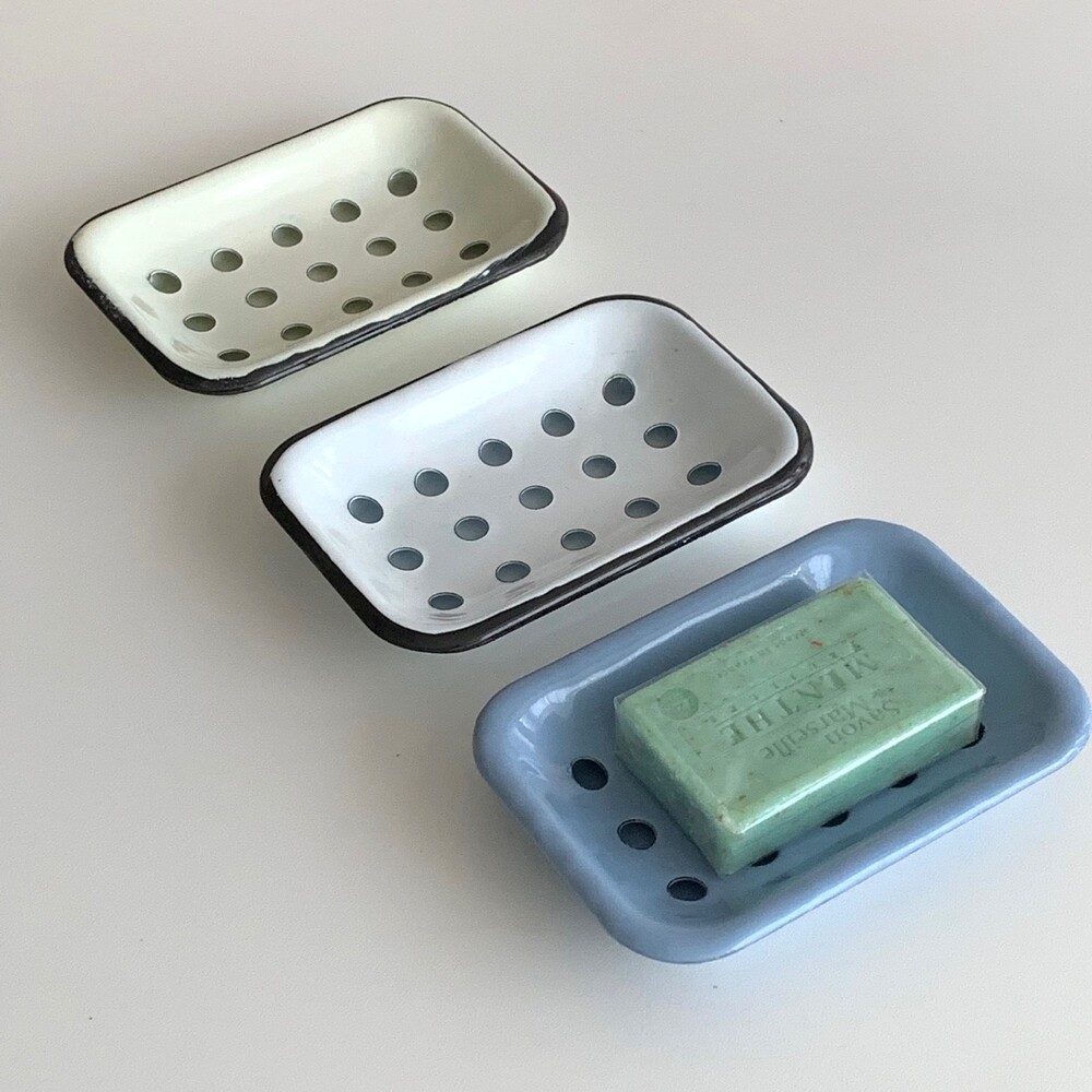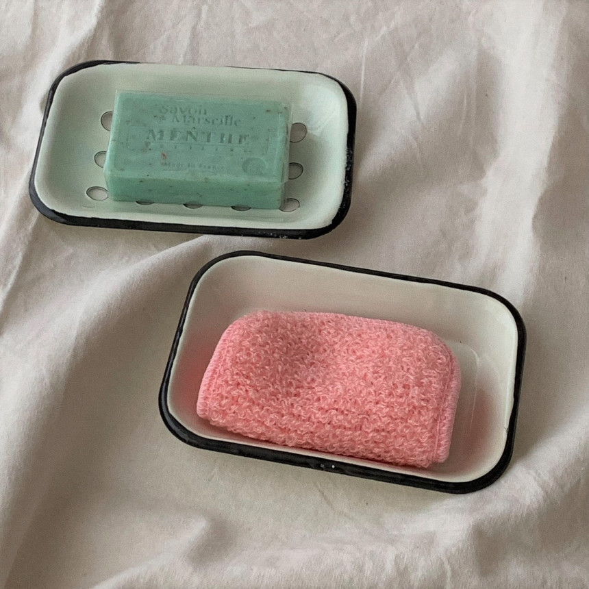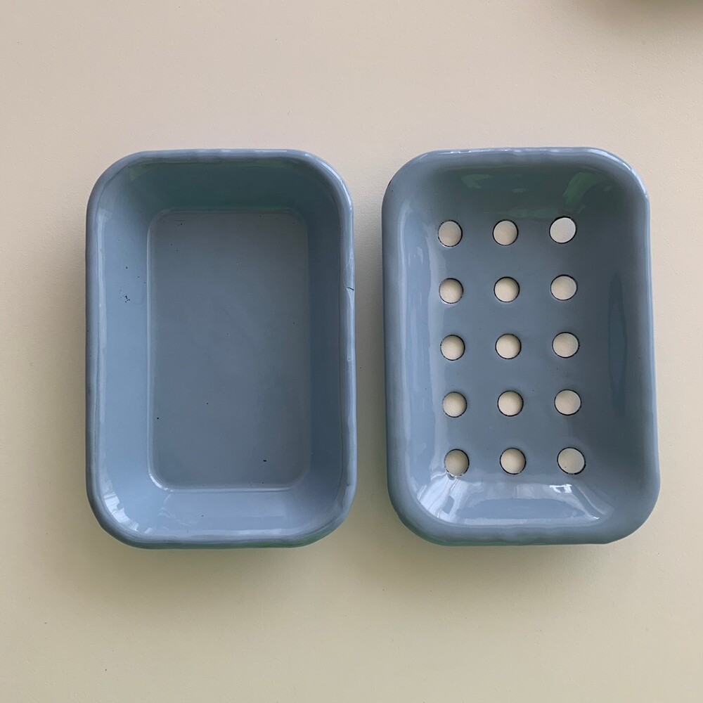 예쁜 비누받침은 정말 찾기 어려운데요, 유럽에서 볼 법한 법랑 소재의 비누트레이를 발견해 소개해드립니다. 물 빠지는 구멍 트레이와 아래 물 받치는 용도의 트레이로 2중으로 구성되어 있습니다. 비누 뿐만 아니라 수세미나, 세제용기 등을 올려놓고 사용하기에도 좋아요. 욕실이나 주방에 법랑 소재의 받침을 두니 분위기가 한층 달라집니다. 주의하실 점은 아주 정교하게 만들어진 제품이 아닙니다. 마감이나 페인트칠이 빈티지한 느낌으로 되어 있으니 민감하신 분들은 구매를 매우 신중히 부탁드립니다.