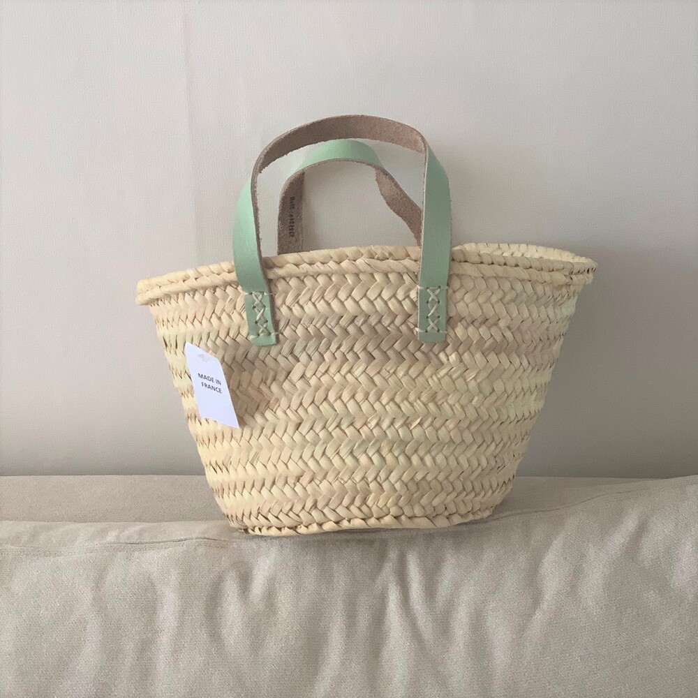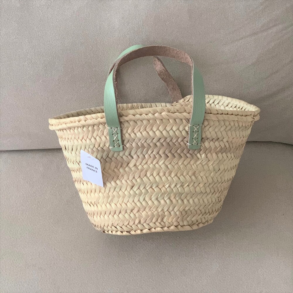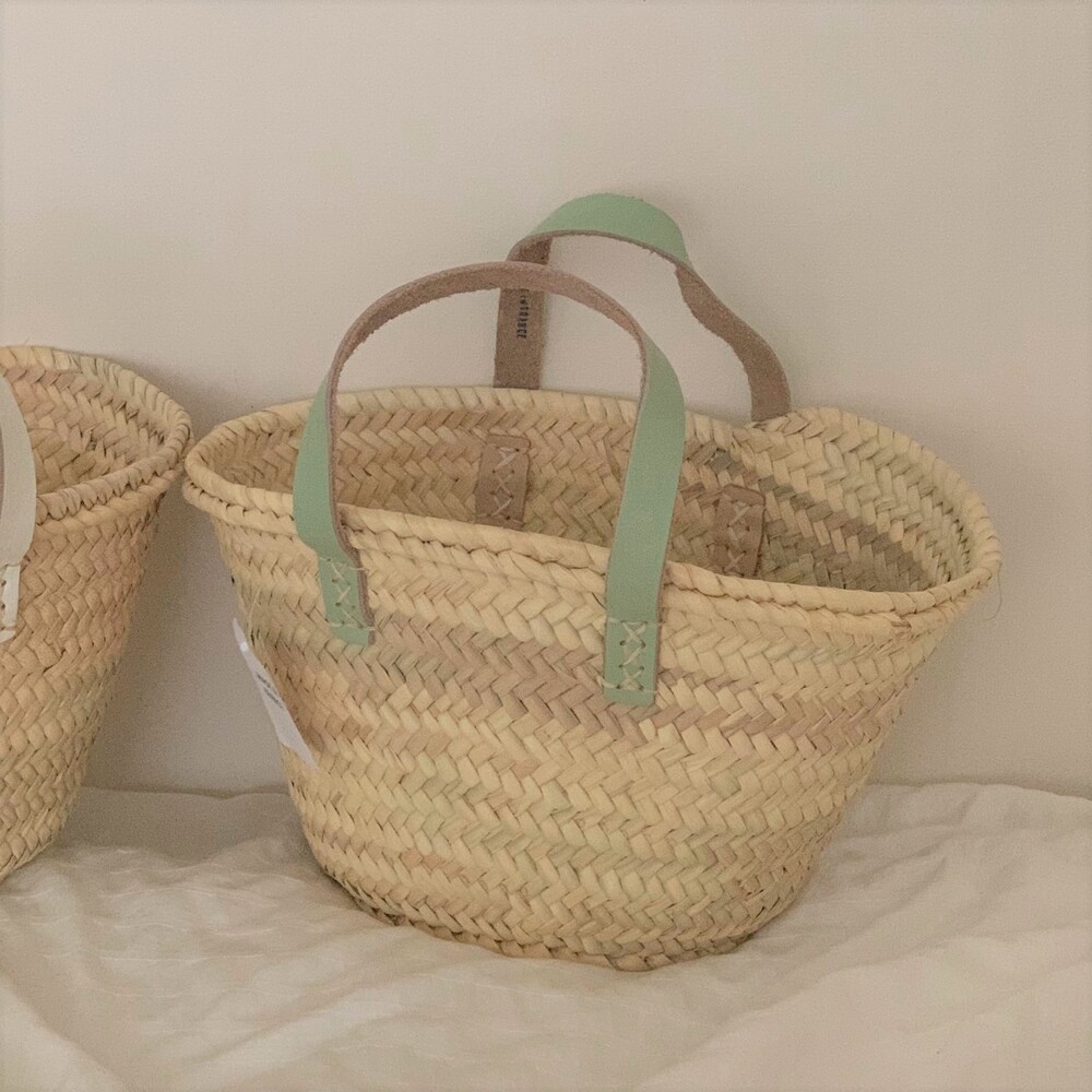 기본 마르쉐백 모양에 민트컬러의 가죽으로 손잡이를 더했습니다. 토트백으로 가볍게 들기 좋은 사이즈와 모양입니다.