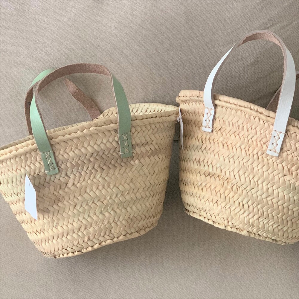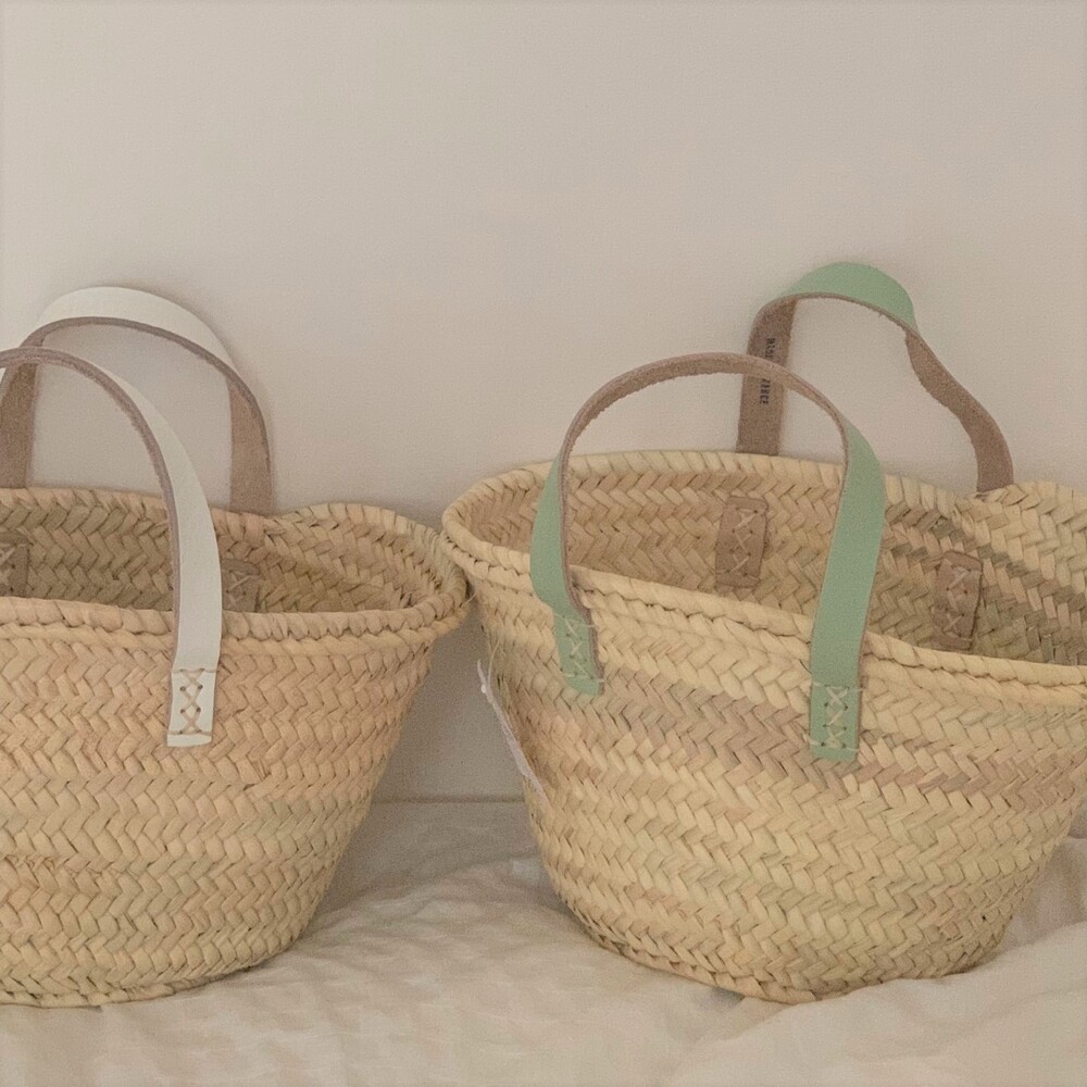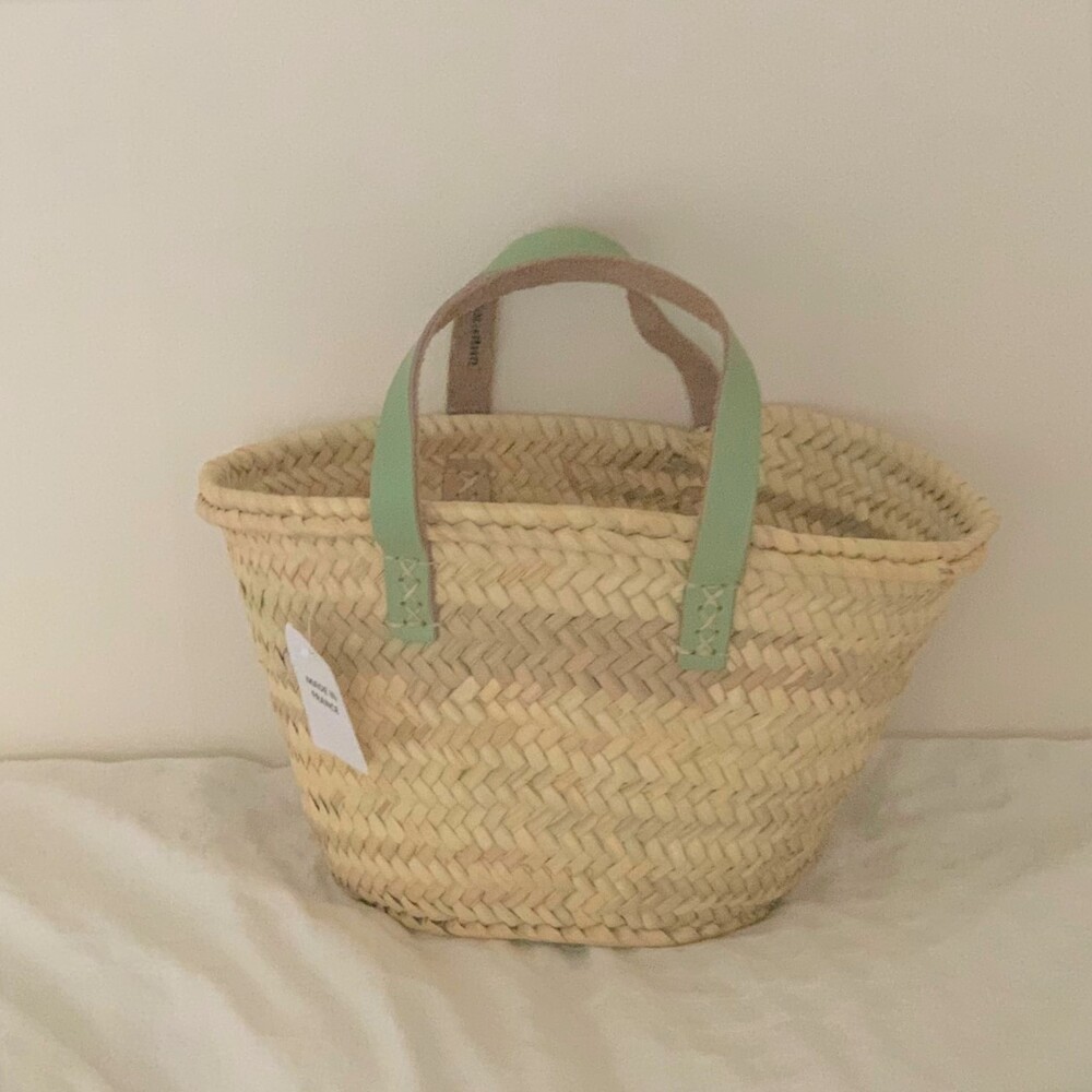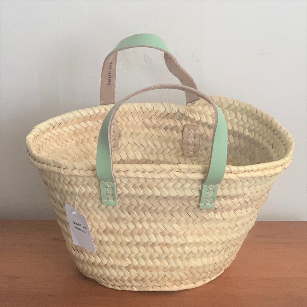 기본 마르쉐백 모양에 민트컬러의 가죽으로 손잡이를 더했습니다. 토트백으로 가볍게 들기 좋은 사이즈와 모양입니다.