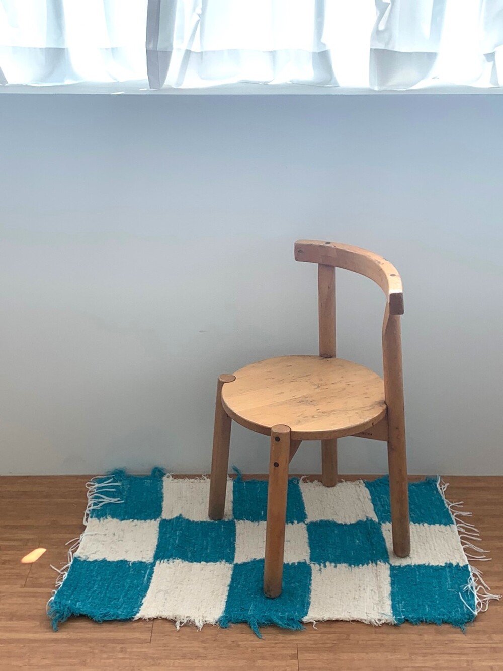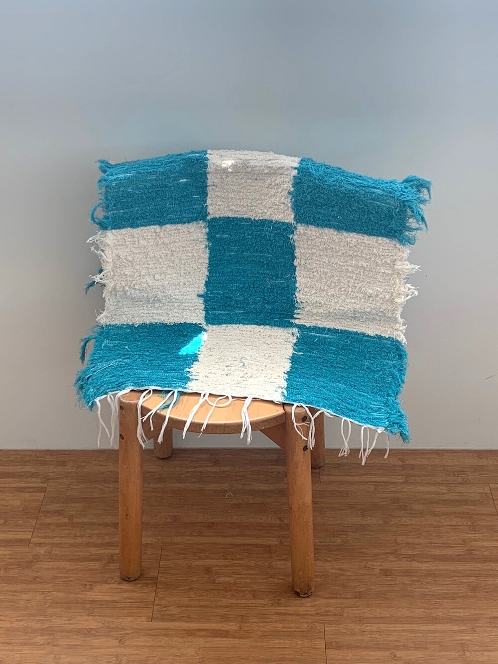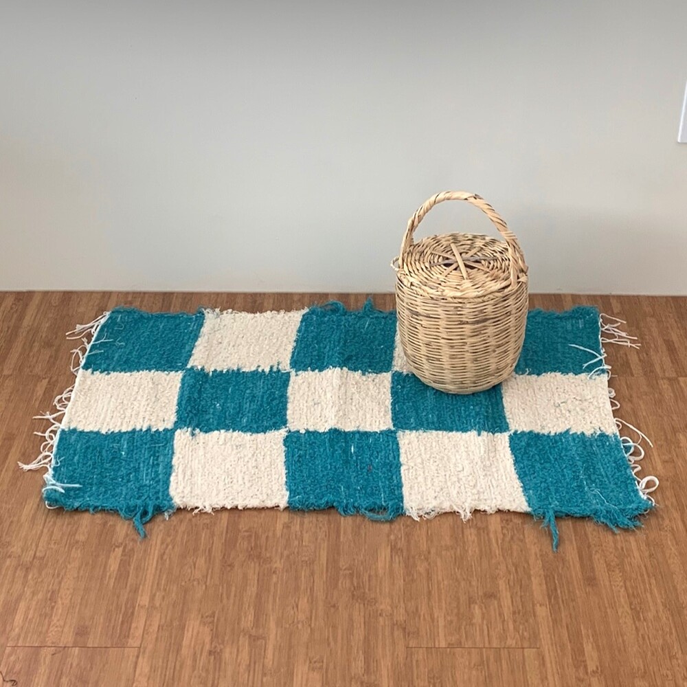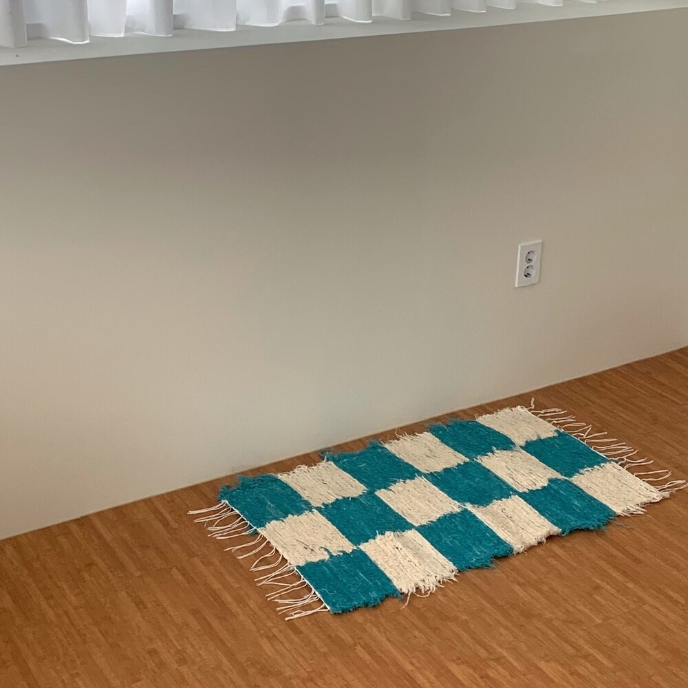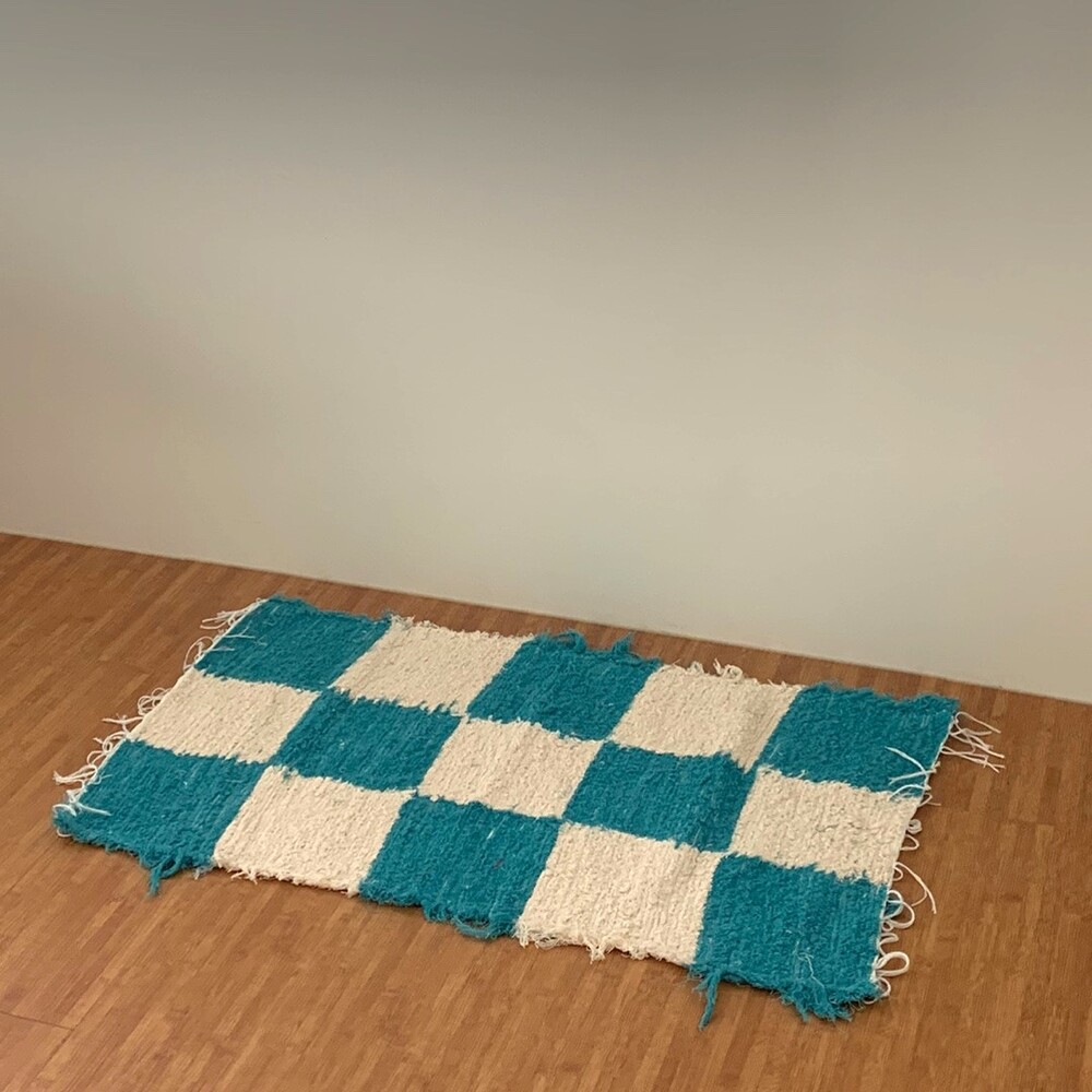 블루와 크림 컬러 체커가 교차된 러그 입니다.