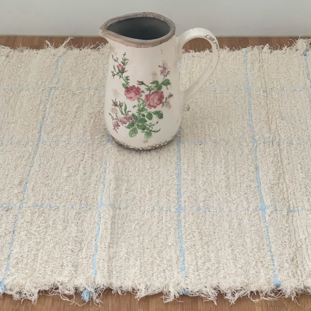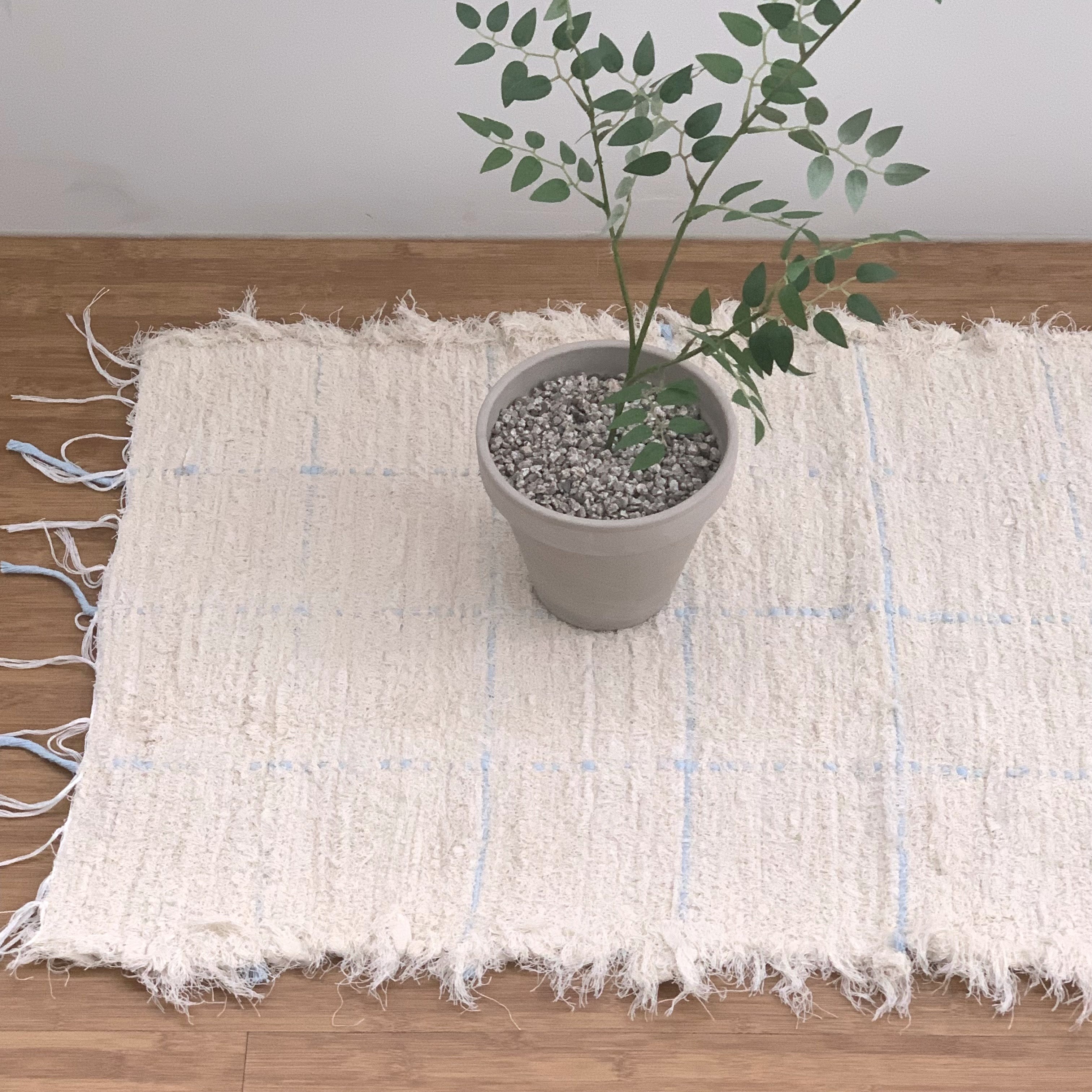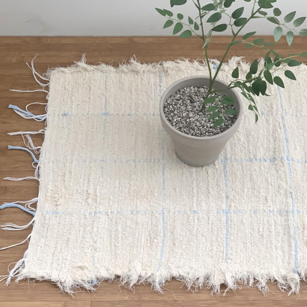 크림컬러 바탕에 하늘색으로 스퀘어 라인이 더해진 러그입니다.