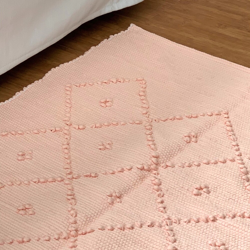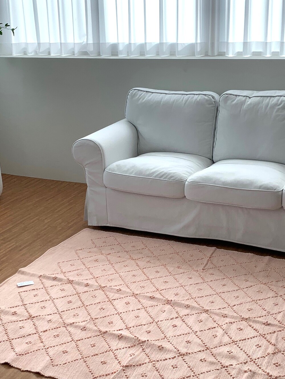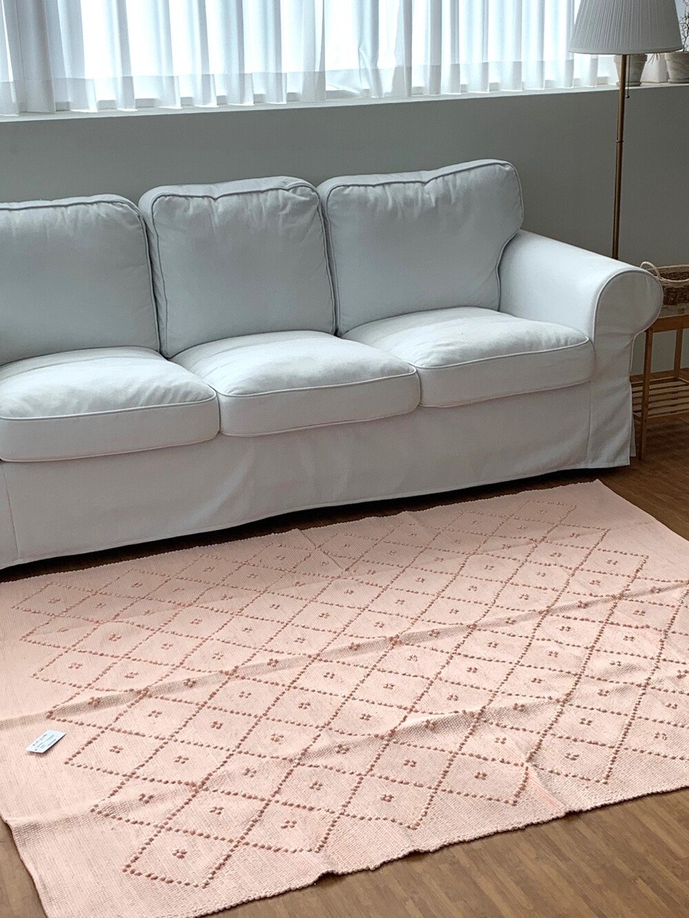 피치 컬러에 도톰한 다이아몬드 디테일이 돋보이는 라지 사이즈 러그 입니다.